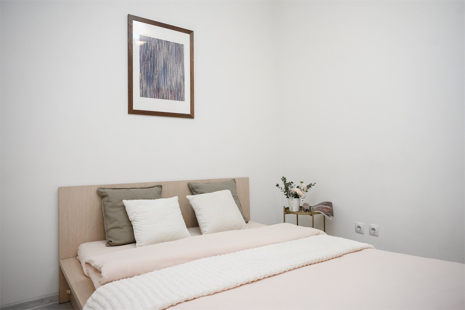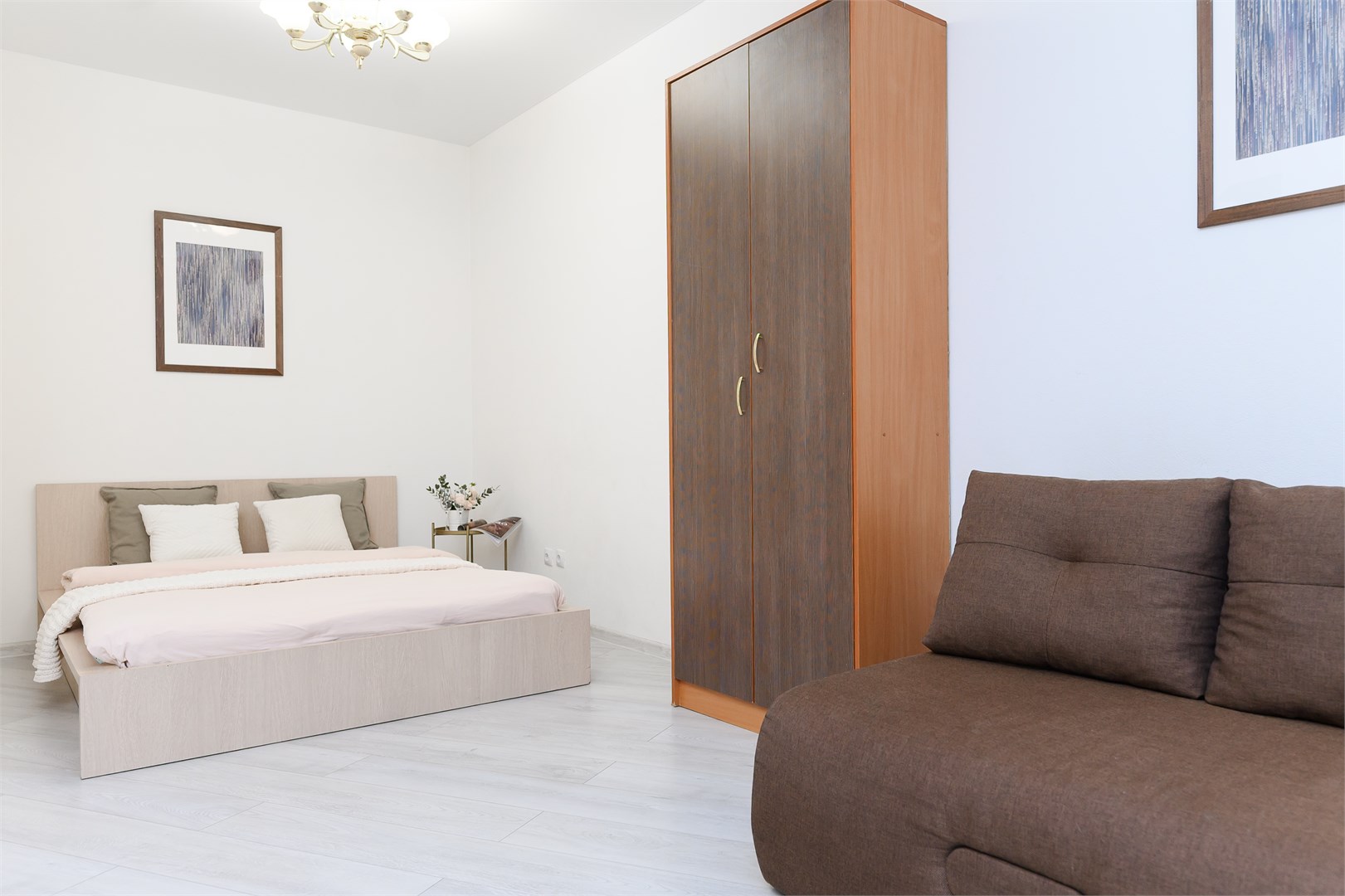 - Мебель: вешалка, диван раскладной, зеркало, кровать двуспальная, прикроватный столик, стол, стулья, шкаф