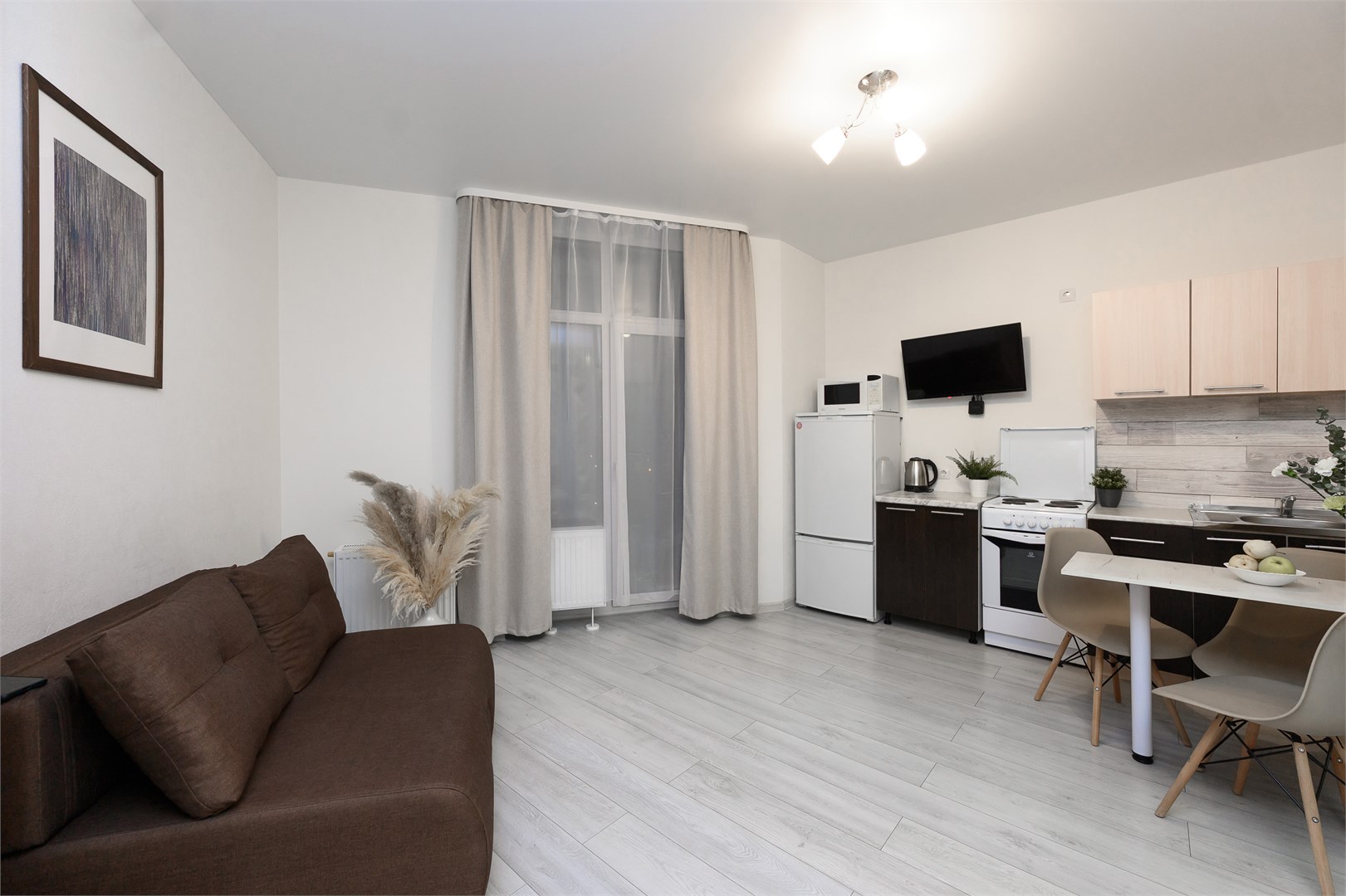- Оборудование: гладильная доска, духовой шкаф, микроволновая печь, набор посуды, плита электрическая, стиральная машина, сушилка для белья, телевизор, утюг, холодильник, электрочайник